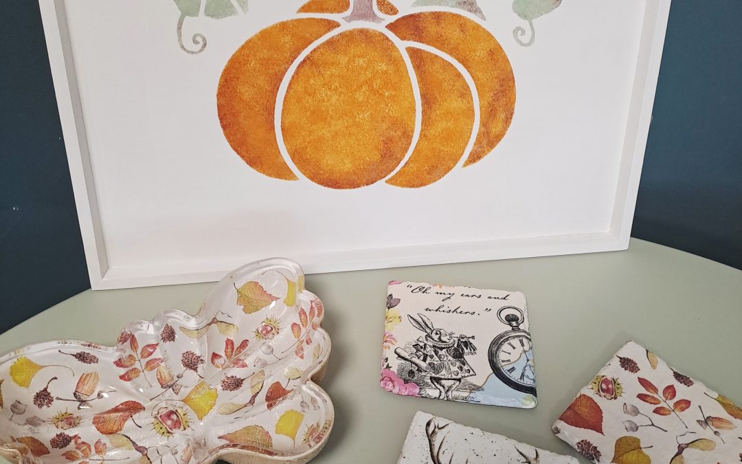 TRAYS – 18th Oct, 1st Nov – we will use stencils and Frenchic paints to turn plain wooden trays into unique pieces. If you fancy pumpkins for a Halloween tray, then we have you covered. If you’d like to bring a stencil of your own to make something special to you, that’s fine too. It need to be A4 in size to fit the tray.